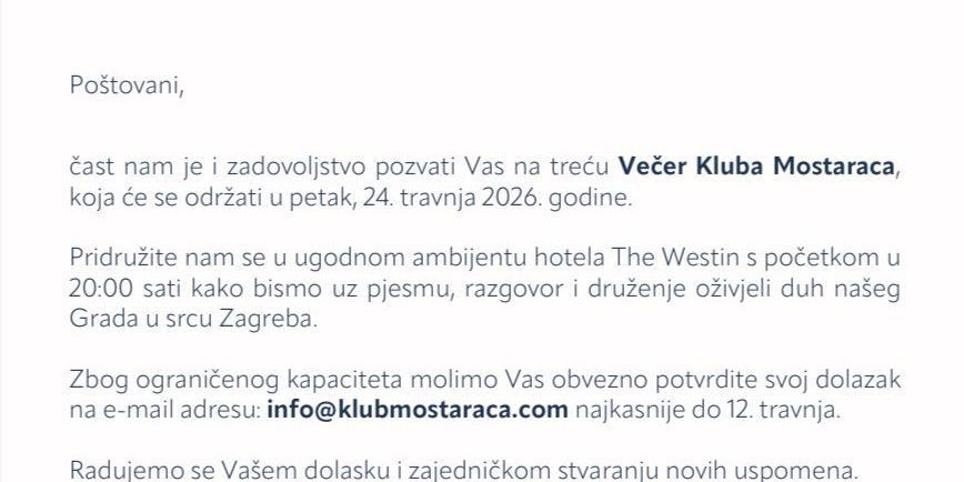 Klub Mostaraca s velikim zadovoljstvom najavljuje održavanje treće Večeri Kluba Mostaraca, koja će se održati u petak, 24. travnja 2026. godine, u Zagrebu.